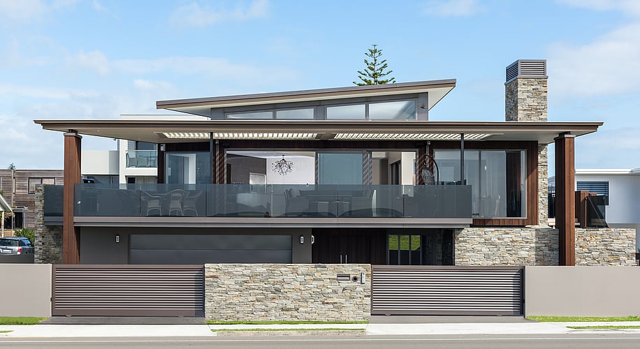 The stunning exterior of this build highlights the classic combination of stone, timber and glass. A rustic mix of Central Otago schist and Western Red Cedar blends seamlessly with the concrete block base and Sto Plaster cladding. Bring into the equation the balance of aluminium joinery and tinted balustrading, this coastal home is a reflection of a competent design and build process.